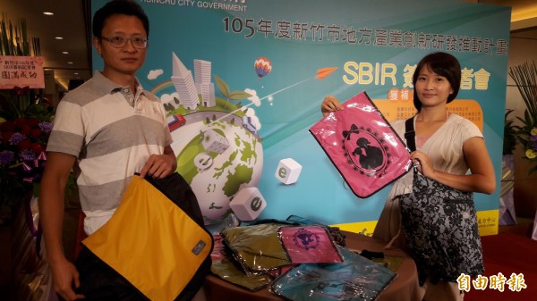 兩個孩子的媽媽設計出可讓親子共背的親子變裝包,獲得新竹市府SBIR的補助,且獲得日本和法國及馬來西亞等國家的訂單,是中小企業創新創業的典範。(記者洪美秀攝)