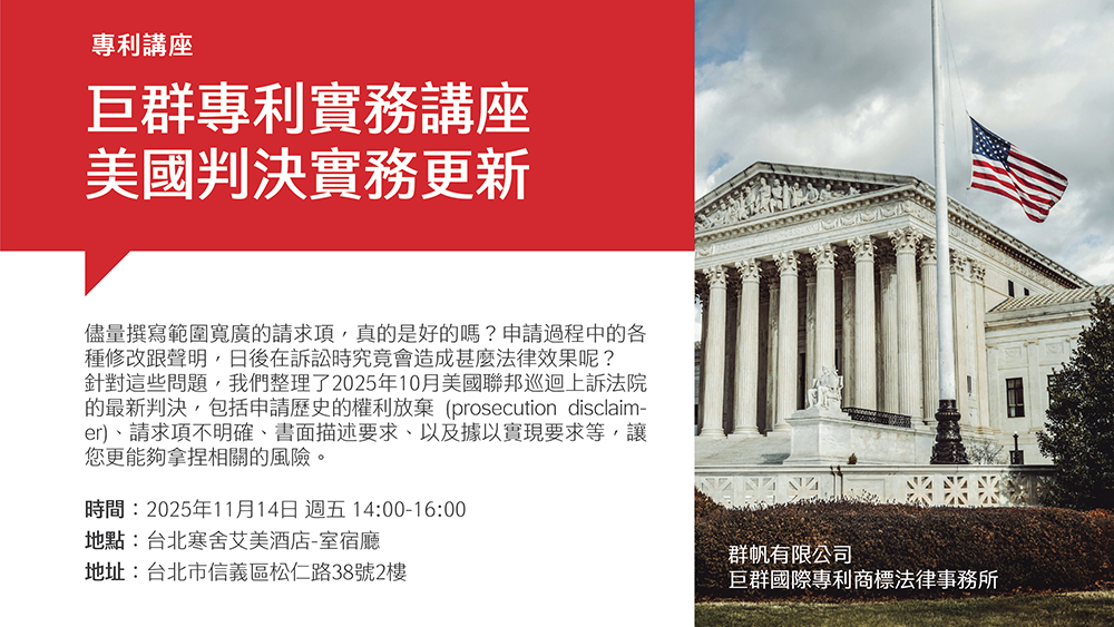 針對這些問題,我們整理了2025年10月美國聯邦巡迴上訴法院的最新判決,包括申請歷史的權利放棄 (prosecution disclaimer)、請求項不明確、書面描述要求、以及據以實現要求等,讓您更能夠拿捏相關的風險。