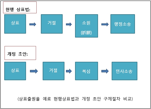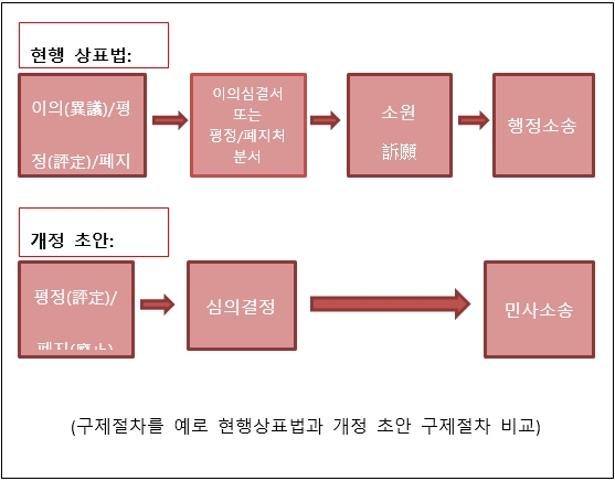 개정 초안은 상표 복심 및 쟁의사건의 심의결정에 대하여 불복하는 경우, 소원(訴願)절차를 거치지 않고 지식재산 및 상업법원에 바로 소송을 제기할 수 있도록 규정하고 있다. 이 부분에서 개정 초안의 규정은 현행 상표법과 큰 차이가 있는데, 현행 상표법 쟁의사건의 구제절차는 4단계가 있지만, 개정 초안의 경우 쟁의사건에 대해 당사자가 심의결정에 불복할 경우 직접 소송을 제기할 수 있도록 규정하여 소원(訴願) 절차를 줄였다.